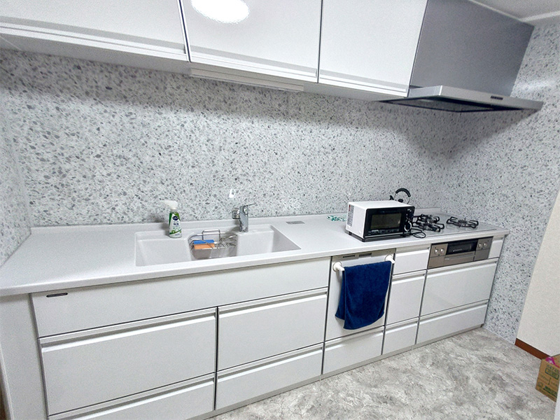 今回の工事では、もともとL型だったキッチンをI型に変更したいというご要望に合わせ、ガス配管スペースを確保するため奥の壁を100㎜ふかし、見た目もすっきりと仕上げています。