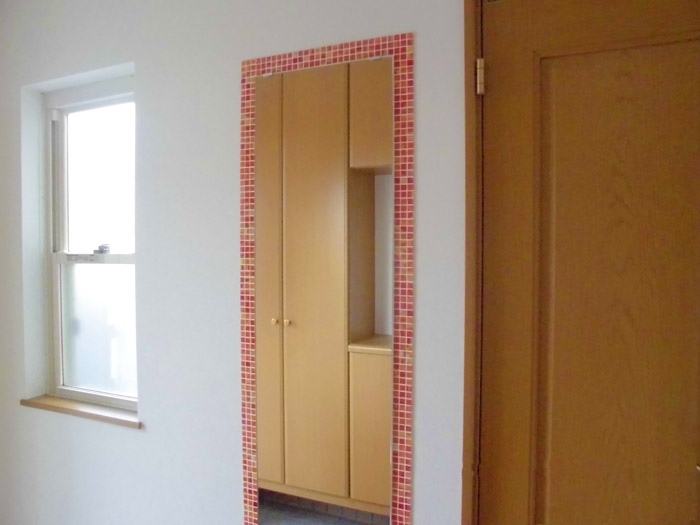 お客様から玄関に姿鏡を付けてほしいとの依頼をいただきました。そのまま取り付けると味気がないので、モザイクタイルを使って高級感を演出しました。