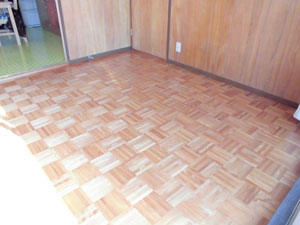施工させていただく床が真四角でしたので加工する部分もほとんどなく、工事の時間を短縮できました。また、床の補修は傷んでる所を撤去し、下地を補強した上でフローリングを貼りました。フローリングの色もお客様のイメージ通りで大変ご満足いただけて良かったです。